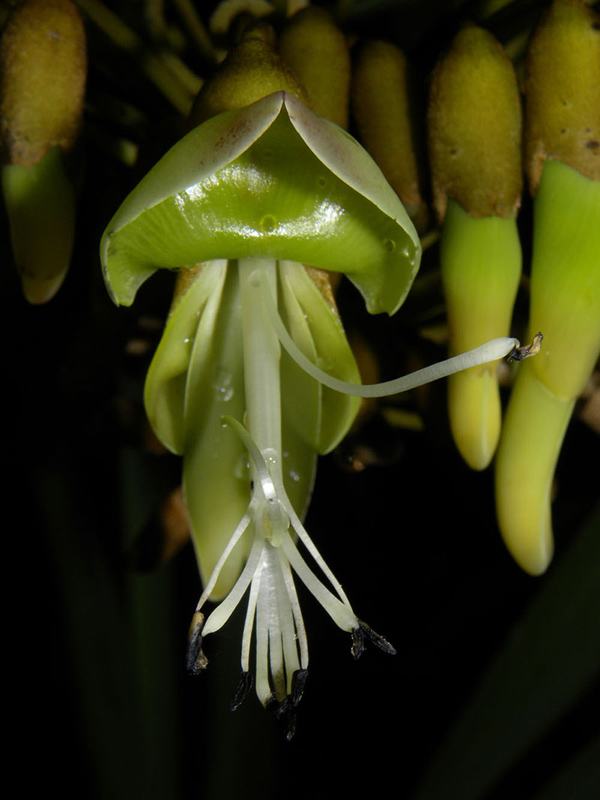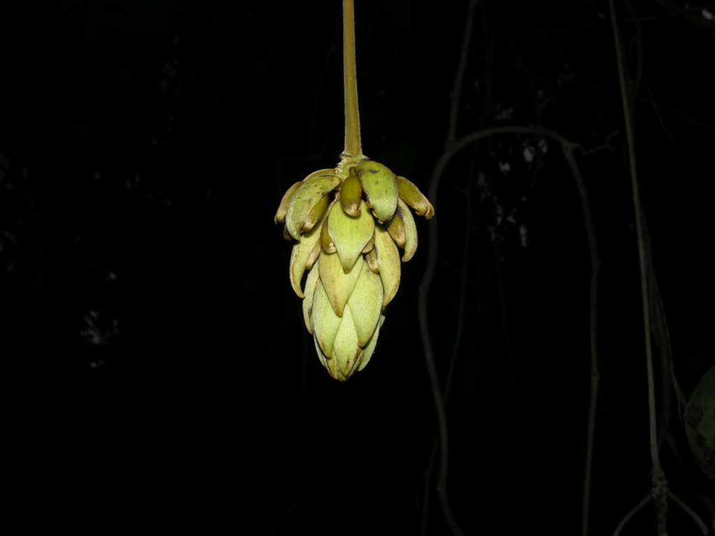 Tamara Bonnemaison (who wrote this text) was inspired to learn more about Mucuna holtonii after reading a National Geographic article about plants that “speak” to bats. This beautifully-written article, “Call of the Bloom“, follows the work of Dr. Ralph Simon through his discovery that many bat-pollinated tropical plants have special features that reflect sonar in particular ways, allowing bats to quickly find them in the dark and over large distances. Mucuna holtonii was one of the first species examined for its capacity to guide echo-locating bats to its nectar-rich flowers. This neotropical vine grows high in jungle canopies of central America, and dangles its flower clusters on long stems, isolating the night-blooming flowers from surrounding vegetation. This on its own provides ideal conditions for bats to locate the flower and access its nectar, but the species makes this process even easier through an adaptation that bounces back the bat’s sonar at a high amplitude.