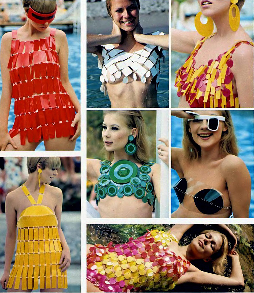 “Paco Rabanne’s starkly geometrical plastic swimsuits employ contemporary materials with a classic simplicity, conjuring up timeless images. Rabanne’s modern male-female approach is most apparent in air-conditioned outfit, above right, designed to show and shield a fair lady. The girl in the center wears a bolero of disks emblazoned with concentric circles, suggesting the armor of Attic warriors. The lass on her left, peering through one of Poco’s opulent optics, shielded by breastplates that further delineate a common interest of ancient and modern times…”