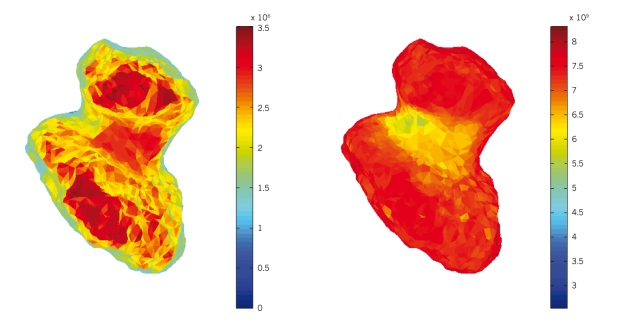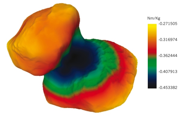 Using data from the Optical, Spectroscopic, and Infrared Remote Imaging System (OSIRIS) and the Radio Science Investigation instrument, the Rosetta mission team calculated the comet’s gravitational field1. The gravitational potential (pictured) also takes into account a pull caused by the comet’s rotation. The resulting force is greatest on top of the lobes, but it is about six times weaker in the neck region, where dust can lift off more easily. The team also used the data to calculate the comet’s density, finding that the body is relatively fluffy and porous — with a density of around half that of water, giving clues as to its structure and strength.