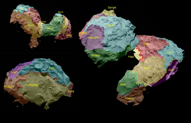 Images taken by the OSIRIS camera reveal vastly different kinds of terrain, including dunes, ripples and fractures. Rosetta scientists have split the comet into regions defined by surface structure (see false-colour image), with each named after an Egyptian god. Hatmehit, for example, is a smooth depression on the ‘head’ of the duck-shaped comet that could be a dust-filled impact crater. Other areas, such as Seth and Hathor, are rough with steep cliff-like structures. However, the porosity of the comet means that rock-like structures are in fact compacted dust. Many structures look as though they are formed by gas moving dust around the surface, say the authors, in the same way that wind shapes sand in a desert.