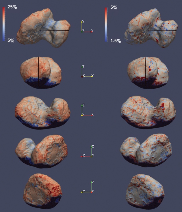 The material that sublimates into space to form the coma, measured by the Rosetta Orbiter Spectrometer for Ion and Neutral Analysis (ROSINA), shows different levels of water, carbon monoxide and carbon dioxide. This “>map shows how the ratio of carbon dioxide to water varied across the surface from 17 August to 22 September 2014. The composition also seems to vary over the 12.4-hour rotation period and with the season.
