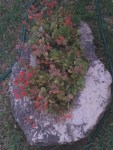 One, a former grinding stone or mortar (pics from another site shown for comparison) has been used as a planter. And the other has been carved with the address of this house.