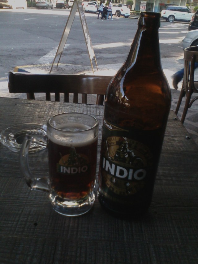 I’ve walked some 3 km and developed a bit of a thirst so I came over, snagged a table facing the street and said, “Solo in cerveza, por favor. ¿Tiene Indio?” “Si. ¿Grande o chica?”