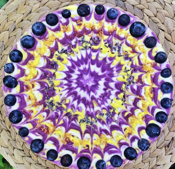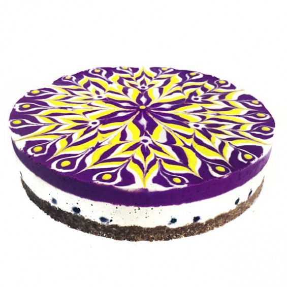 The colors used in McCarty’s cakes are all made from natural plant and fruit extracts. His creations include a banana-jungle nut butter-chocolate cheesecake, coconut-lime-raw vegan cheesecake, and an acai-blueberry-mango cheesecake.