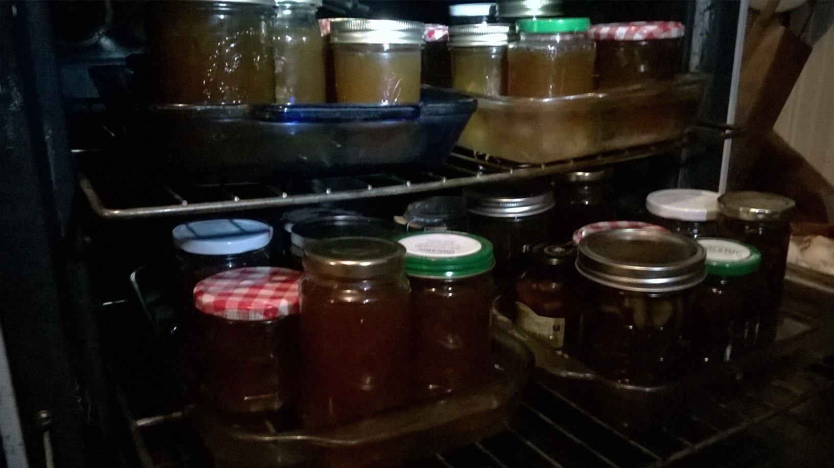 And produced 38 jars of various sizes that is cooling in pans of water in my oven. (it’s the only place they can sit and cool safely)