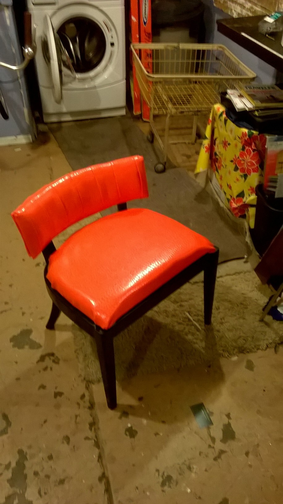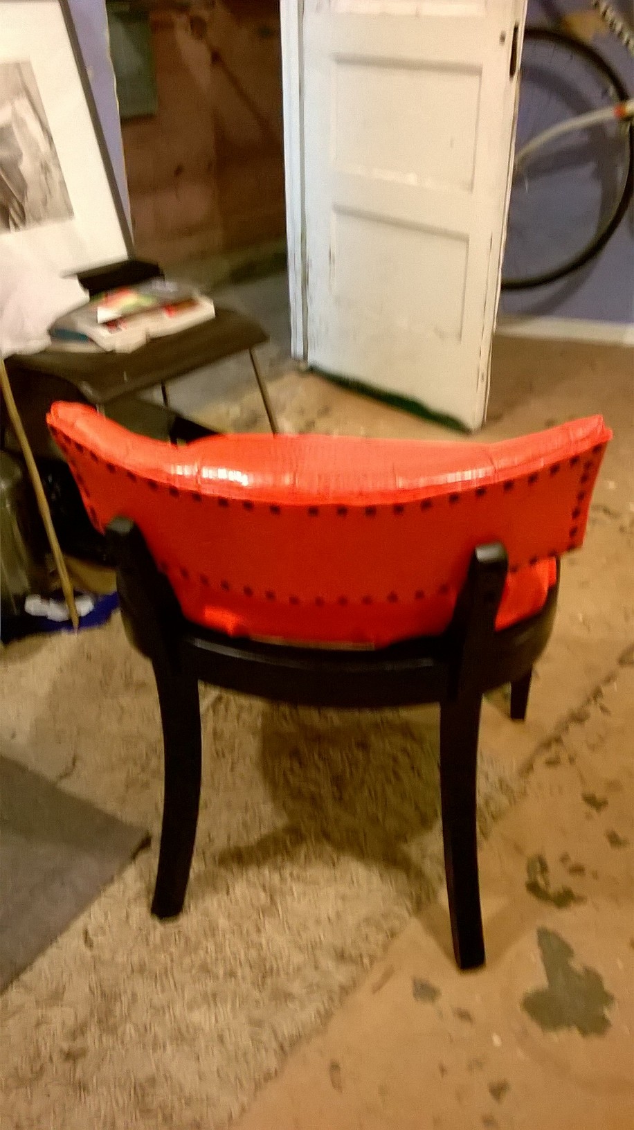 I used the broken seat as a template to create a new seat and upholstered it with a material chosen at random at the fabric store, a bright orange snakeskin vinyl.
