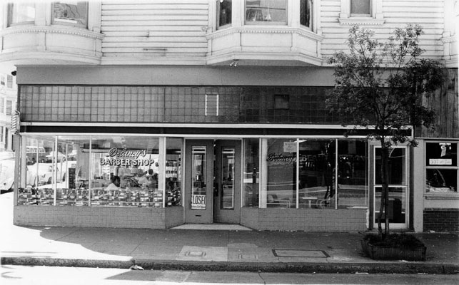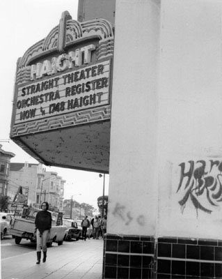 Haight St from Cole St. Oct, 1967 Photo by Tom Kuhn. It shows Haight St in the fall of 1967. It was probably taken from a car or truck just west of Cole St. The Straight Theatre is in the foreground, a red Berkeley Farms sign can be seen at Benedetti’s Grocers (now Wasteland, originally the Sunset Theatre). Note 3 lanes of traffic- 2 westbound, 1 eastbound. And the hippies in the foreground are selling 2 different issues of the Oracle.