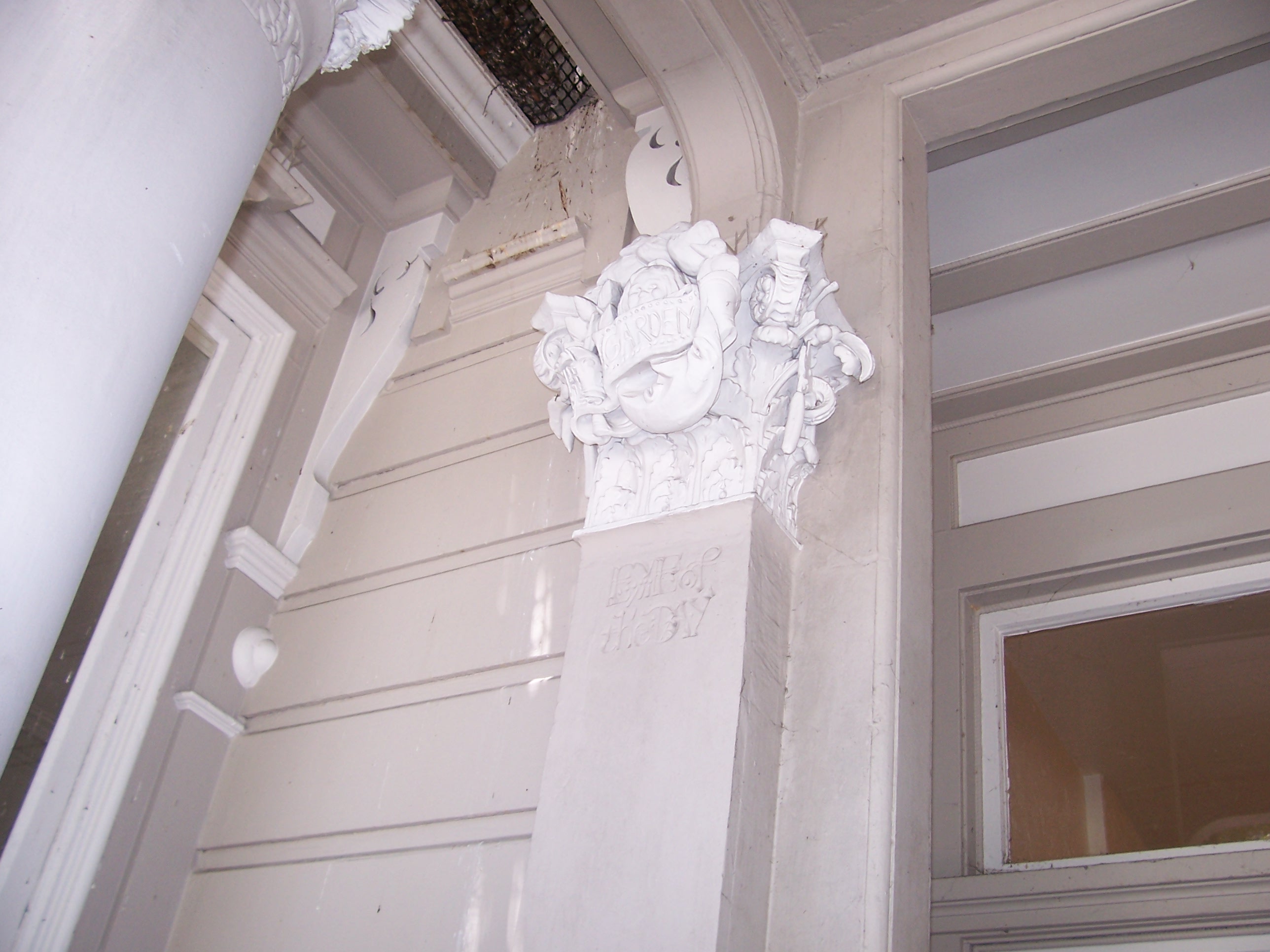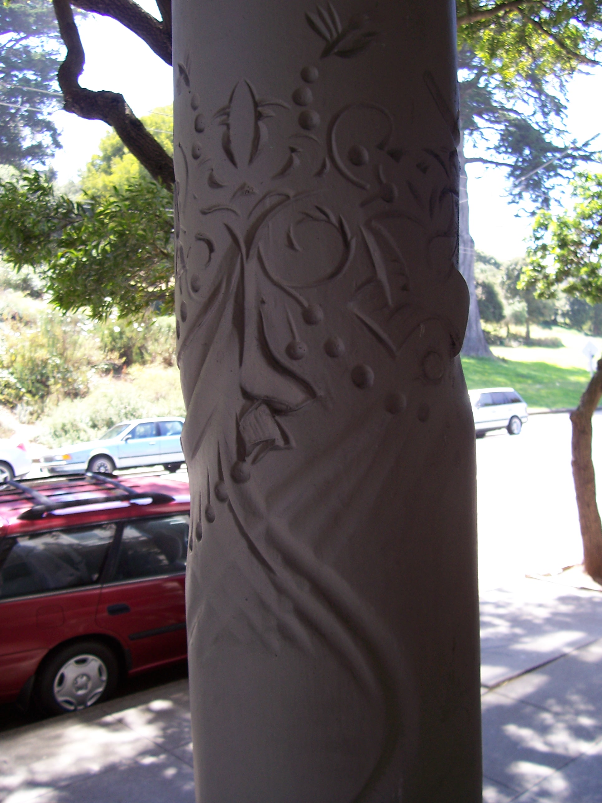 1190-1192 Haight St @ 10 Lyon St Carved by Arlen, ca. 1970s One of the most interesting buildings in the Haight are the apartments at the corner of Haight and Lyon. The pillars, pilasters, and capitals have been elaborately carved with faces, symbols, tools, and cryptic words. My favorite is the 35mm camera (back of camera seen here) with a telephoto lens in the front right capital. Amongst the tulips which surround it there used to be an old-fashioned squeeze shutter release but it has since broken off.