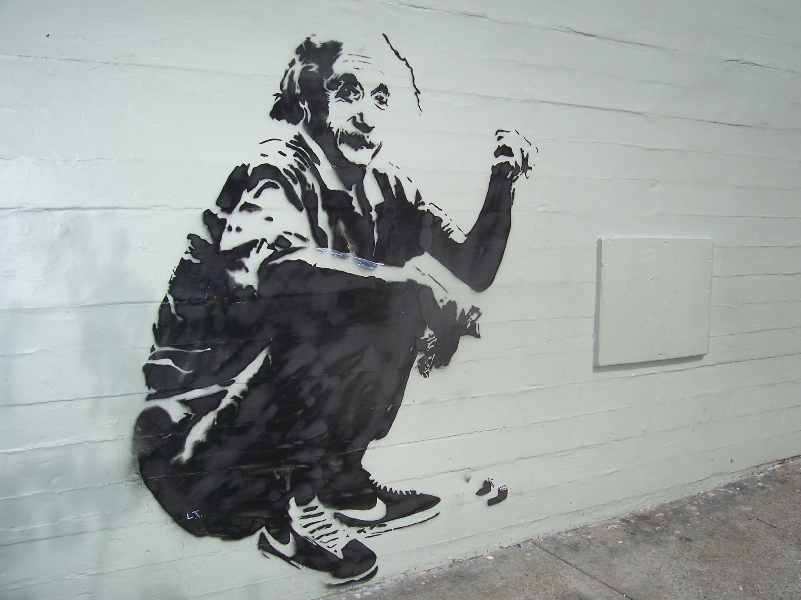 Close-up-Einstein in Nikes at Cole & Haight by Banksy, 2010 This Banksy was painted over by the owners of the building (The HA Free Clinic Foundation) It was worth about $100K.