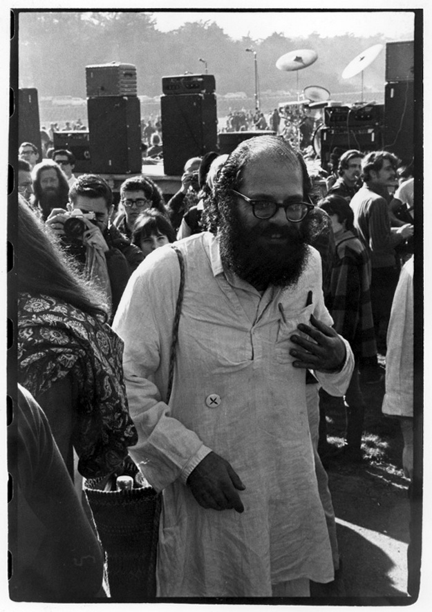 Allen Ginsberg walking through crowd backstage at Human Be-In
