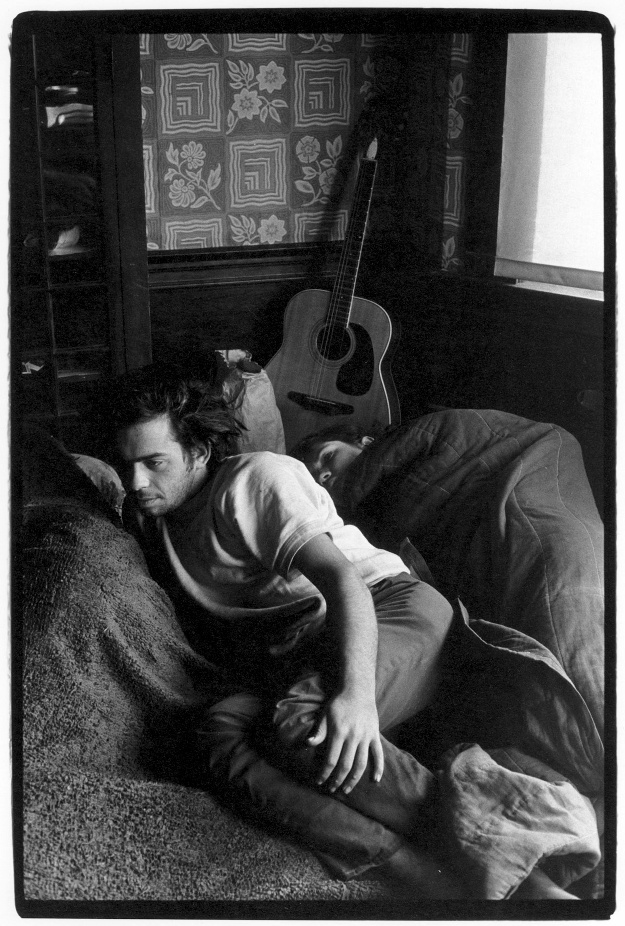 Couple lying on a floor; guitar resting above them
