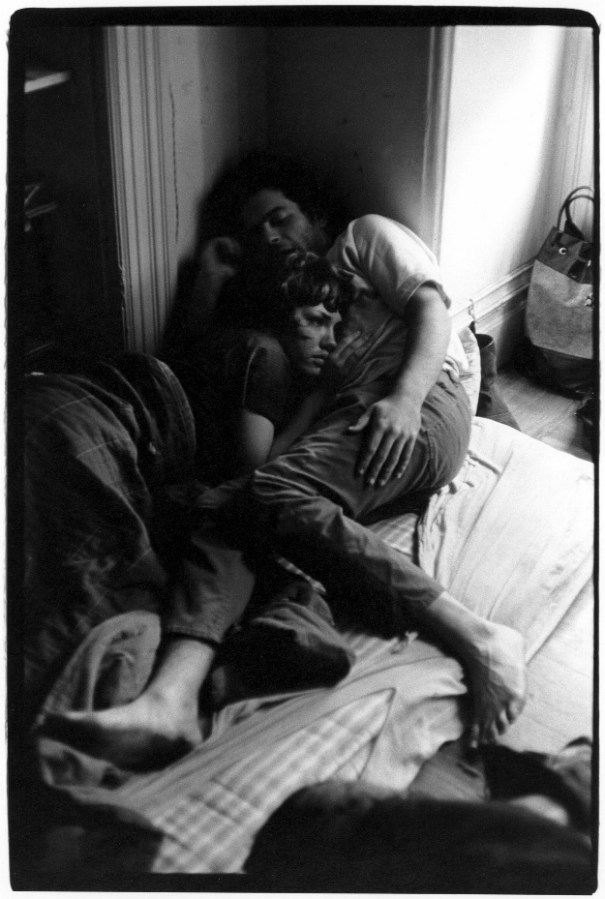 Group of hippies with bags, sleeping bags, and guitar waiting for a ride in San Francisco
