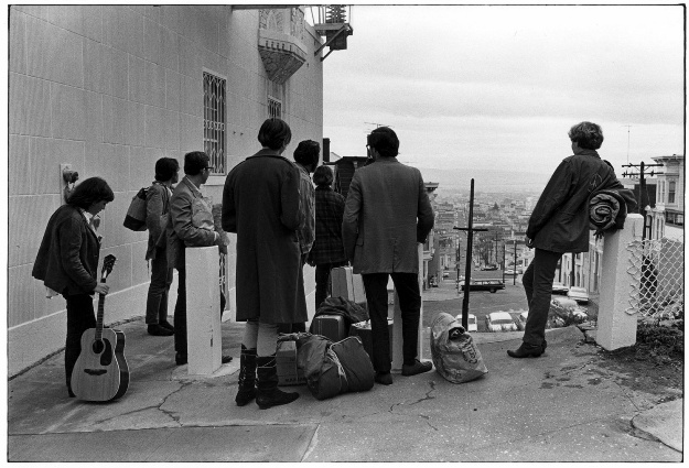 Group of hippies with bags, sleeping bags, and guitar waiting for a ride in San Francisco
