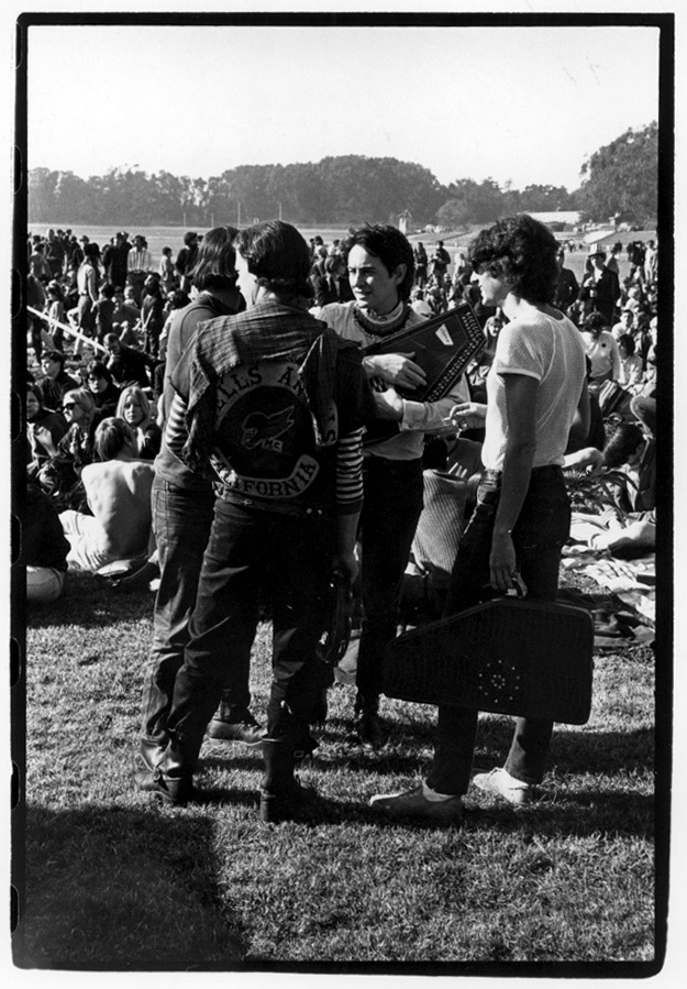 Group of men with autoharps standing in front of a large outdoor crowd at Human Be-In
