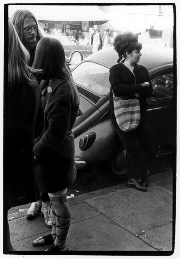 Group of young people talking on a sidewalk; to the side a woman leans against a VW Bug across from Pacific Drugs