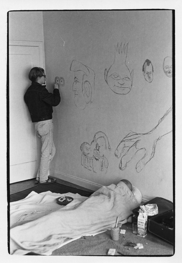 Man drawing on wall while another sleeps on the floor