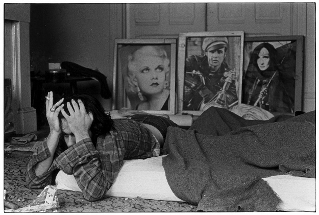 Man holding head with both hands and smoking a cigarette while lying on a mattress on the floor. Posters of movie stars on the wall behind – James Dean, et. al
