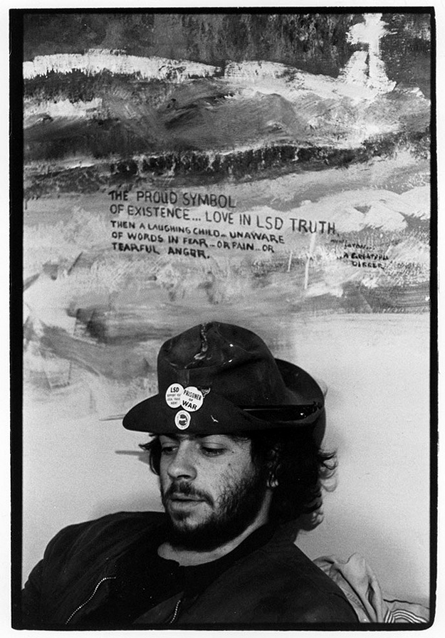 Man in a hat with LSD and anti-war buttons leaning against a hand-painted wall