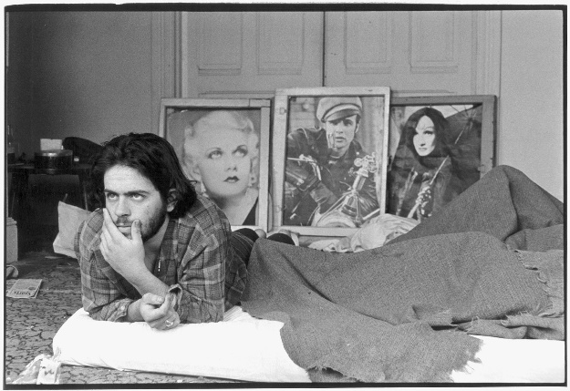 Man lying on mattress on floor with another person under blanket. Three framed large pictures behind