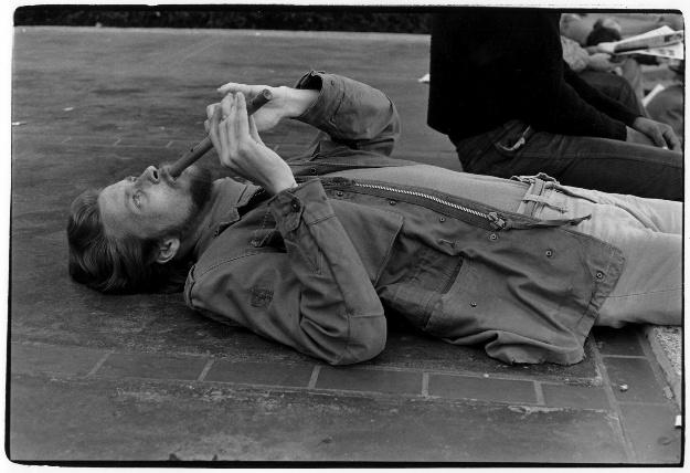 Man lying on pavement playing a wooden flute