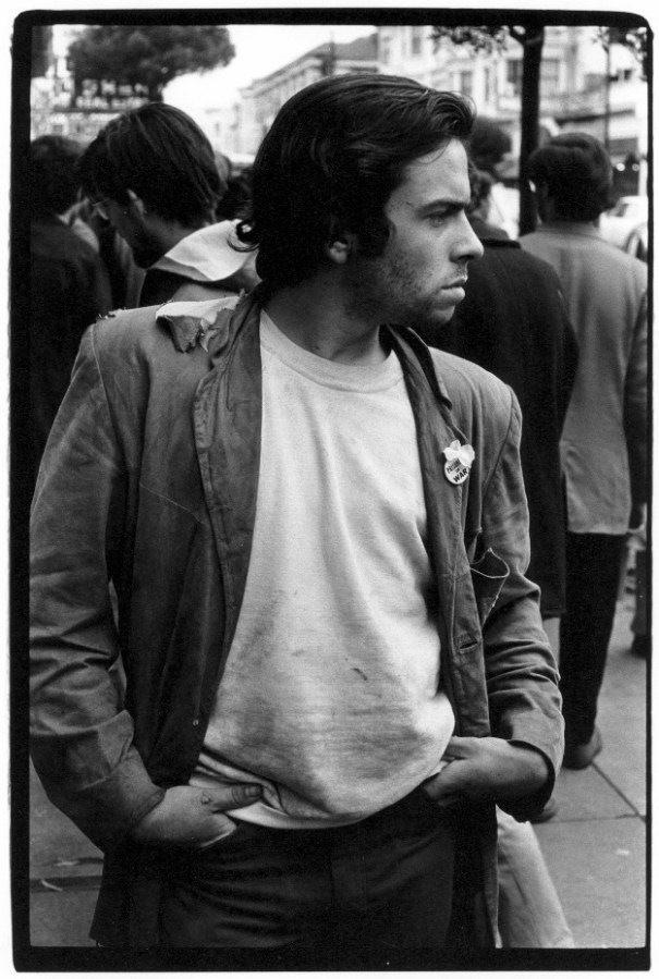 Man on street wearing tattered jacket and a button which reads %22Prisoner of War%22