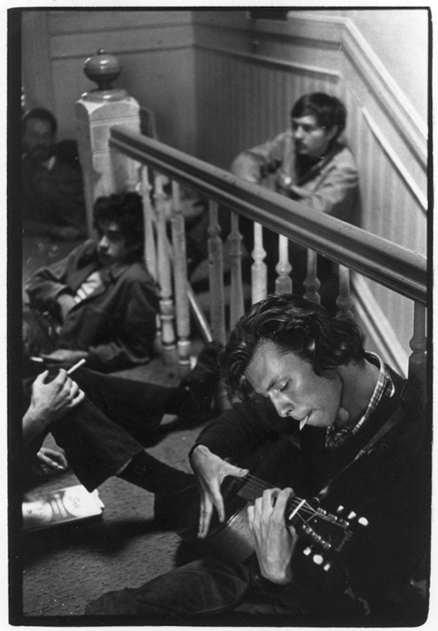 Man playing guitar and hippies in stairwell