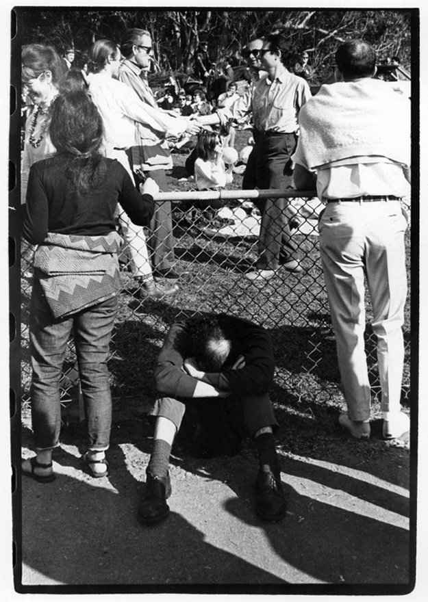 Man sitting on ground with head down while others greet behind him at Polo Field