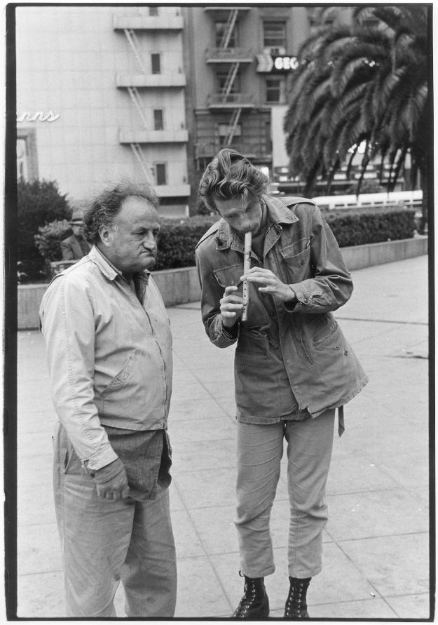 Older man standing next to younger man playing a flute on the street