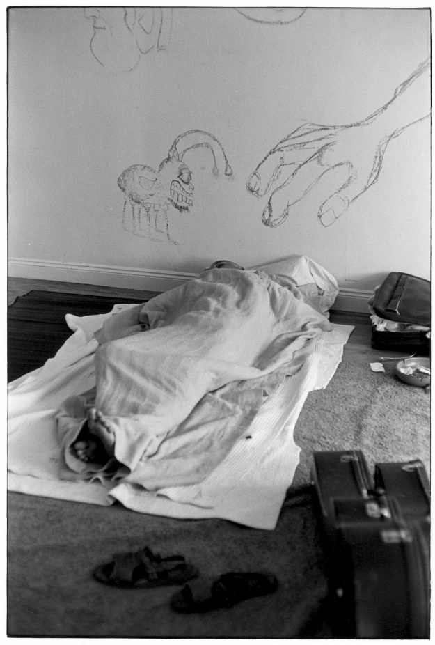 Person sleeping on floor covered by blanket with graffiti on wall behind