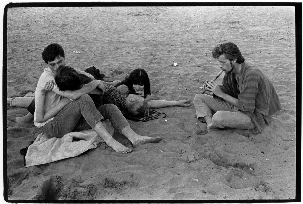 Two couples on a beach with a man to the right playing a wooden flute