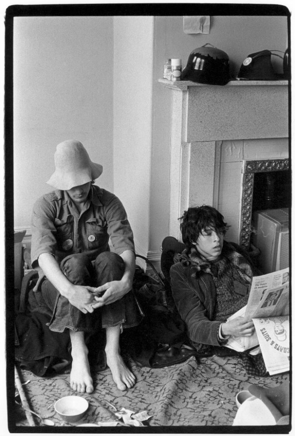 Two hippies, one reading a newspaper