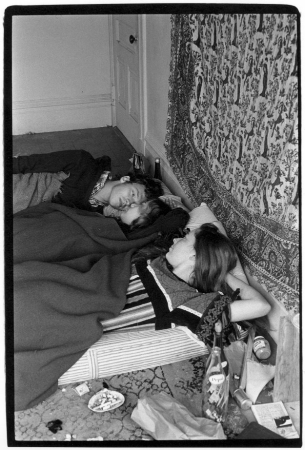 Two women and one man in bed with tapestry on wall behind