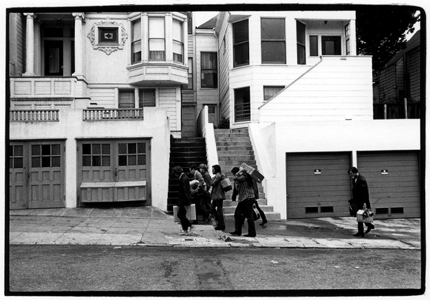View from across the street of a group of young men carrying suitcases and sleeping bags along a sidewalk