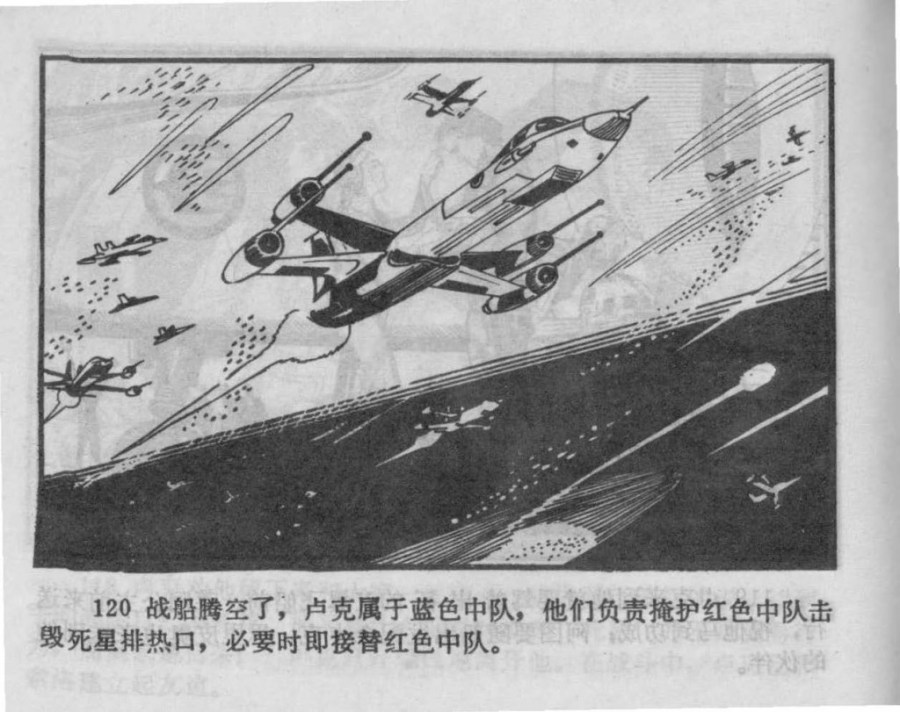 120. The fighters take to the air. Luke belongs to Blue Squadron (lanse zhongdui 藍色中隊) which is tasked with defending Red Squadron during their attack on the Death Star exhaust vent, and, if necessary, step in to take their place.