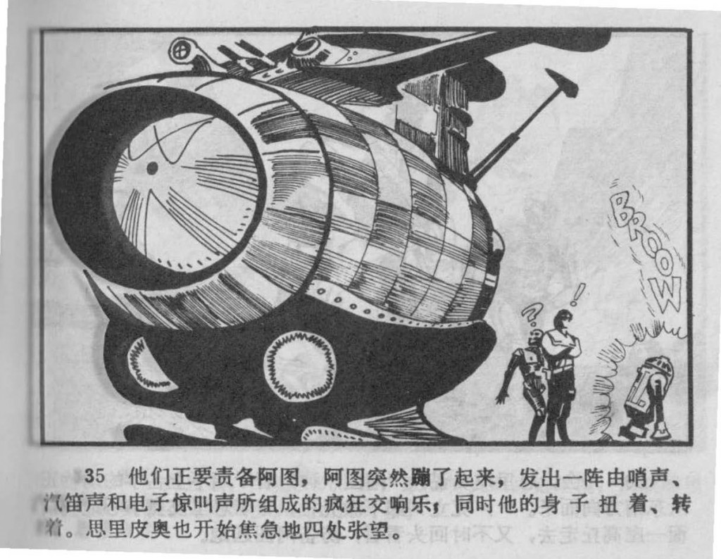 35. Just as they are about to start blaming R2 [for running off], R2 suddenly jumps up and starts to make a mad symphony of whistling, sirens, and electronic alarm sounds; at the same time his chassis twists and turns. C-3PO also starts to look around nervously.