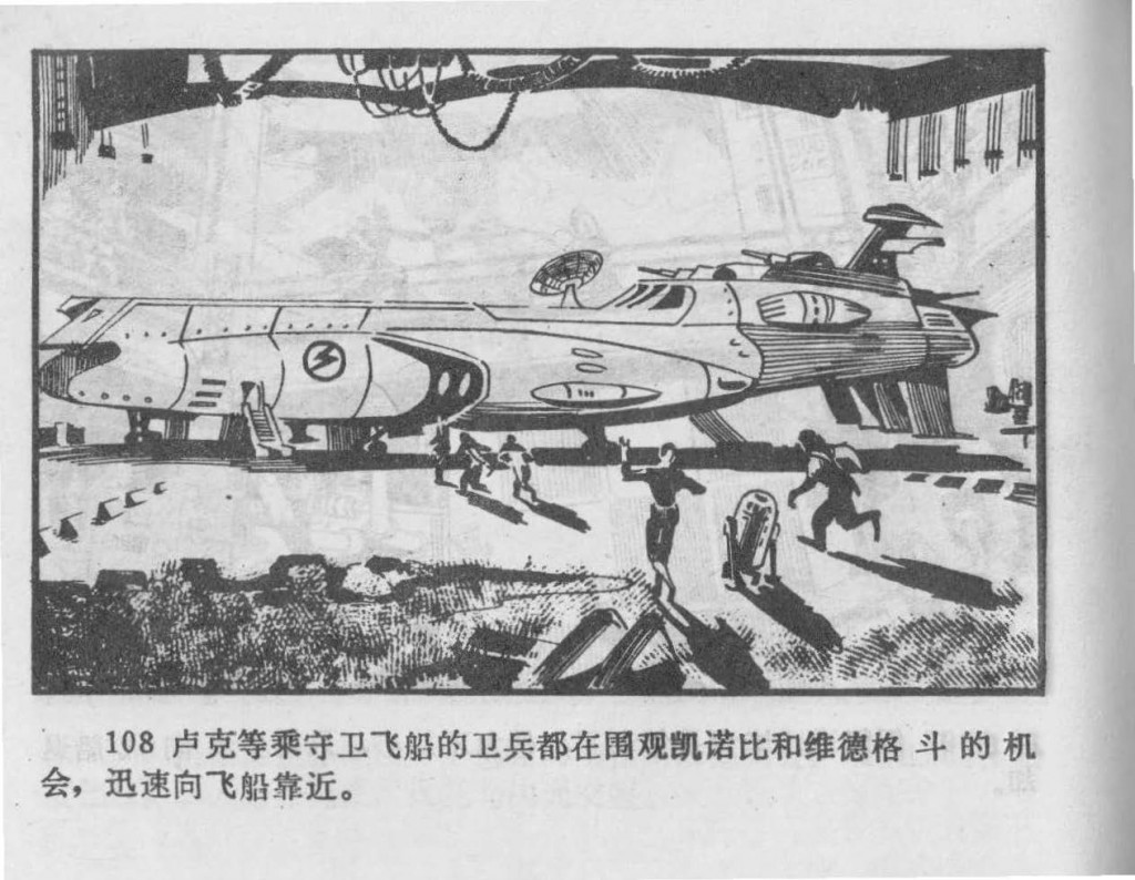 108. Luke the others take advantage of the fact that the guards defending the space craft are distracted by Kenobi and Vader’s fight to quickly make their way to the craft.