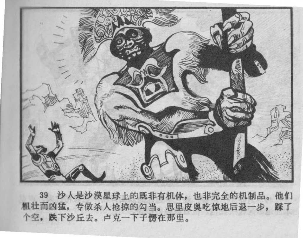 39. The Sand People of the Sand Planet are not organic lifeforms, but they are also not entirely mechanical either. They are strong and ferocious, and specialize in the shady business of murder and plunder. C-3PO steps back in shock, and discovers there is nothing there for him to stand on, and so he falls down the sand dune. Luke finds himself momentarily stunned.