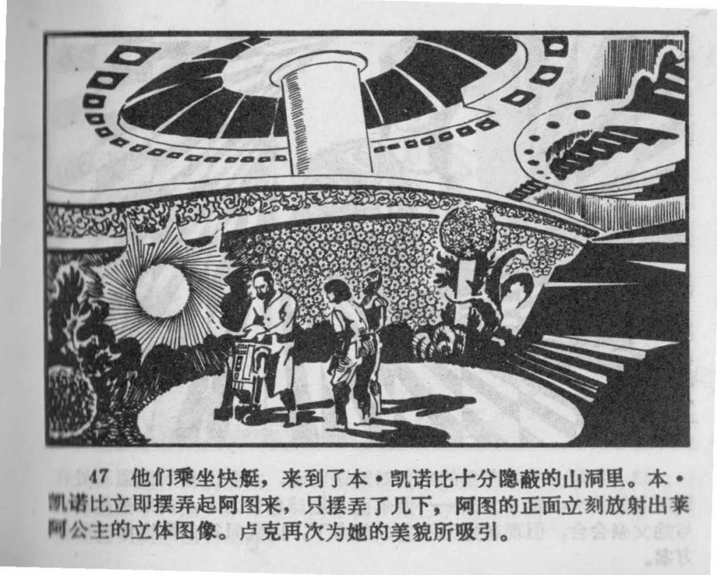47. They ride the speeder to Ben Kenobi’s well-hidden cave. Ben Kenobi immediately begins to work on R2. After only a minute, R2 begins to project the 3D image of Princess Leia from the front of his chassis. Luke again finds himself attracted to her stunning beauty.