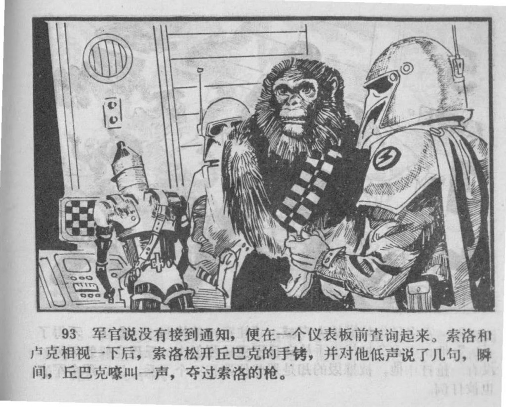 93. The officer says that nobody notified him, and turns to consult his instrument panel. After a quick glance at Luke, Solo unlocks Chewbacca’s manacles and says something to him under his breath. Straight away, Chewbacca roars and grabs Solo’s gun.