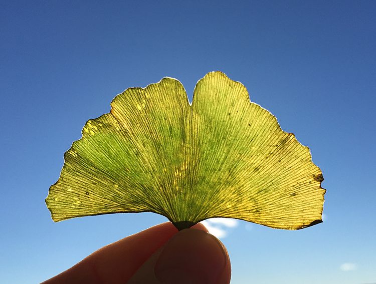 This is a Ginkgo leaf. A species of plant that is over two hundred and fifty million years old. It’s ancient origins can be seen in it’s simple vein structure. they radiate out with minimal bifurcations. Take a look at the much younger maple leaf to see the difference. It’s veins fork and rejoin in a lace-like way. IMHO this is due to evolution creating complexity in the maple leaf.