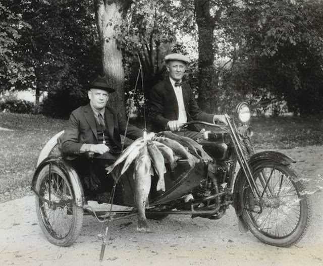 William A. Davidson (in sidecar) and William S. Harley show their catch made on Pine Lake in 1924