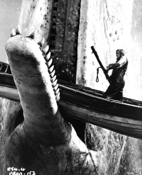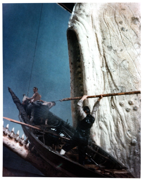 Gregory Peck’s boat is held by the whale’s jaws in a scene from the film ‘Moby Dick’, 1956. (Photo by Warner Brothers/Getty Images)
