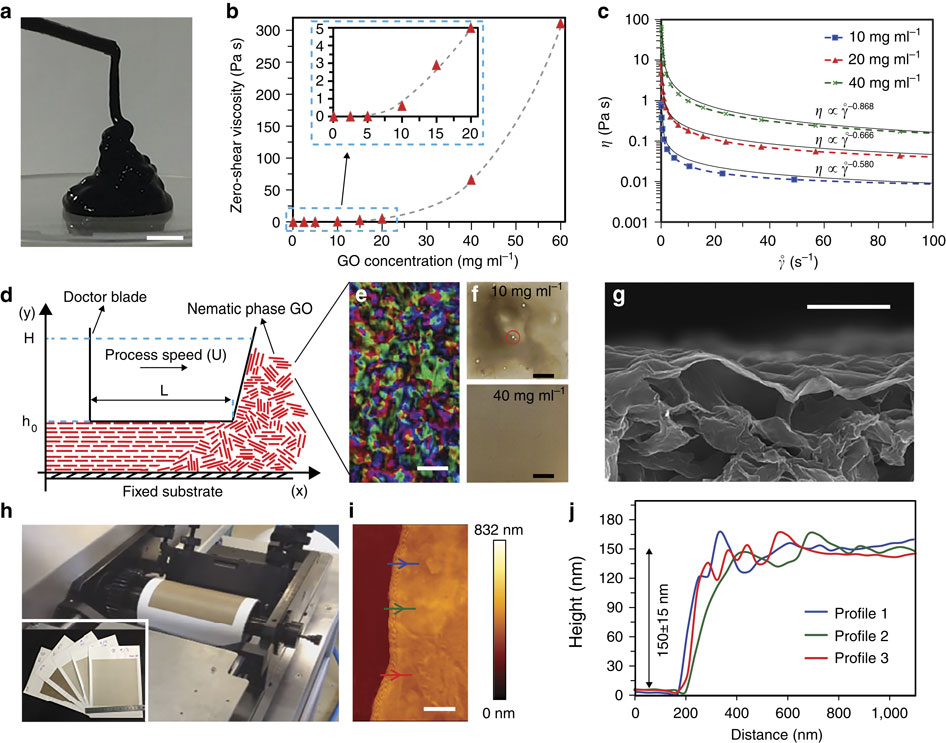 (a) Viscoelastic property of GO (~40 mg ml−1). Scale bar, 1 cm. (b) Zero-shear viscosity of the dispersions increases with increasing GO concentration. Dashed line is a polynomial fit. (c) Rheology data for three different concentration showing shear-thinning behavior. Solid curves are the fit of the experimental data with a power law model. (d) Schematic of shear-alignment processing of a nematic GO to a film; L is the width of blade, h0 is the height of the channel, H is the height of the fluid in front of the blade and U is the processing speed. (e) Polarized light images of fully nematic GO at 40 mg ml−1 (scale bar, 1 μm). (f) The red circle in the photograph identfies dewetting spots in the SAMs, which is eliminated when processed from liquid crystalline GO (scale bars, 1 cm). (g) An SEM image demonstrates continuity and conformity of SAM over a porous Nylon substrate (scale bar, 1 μm). (h) Photograph of the gravure printing machine and (inset) images of 13 × 14 cm2 GO membranes with different thicknesses. (i,j) AFM height map and corresponding height profiles of our membrane (scale bar, 1 μm).