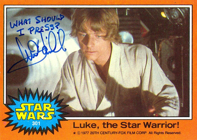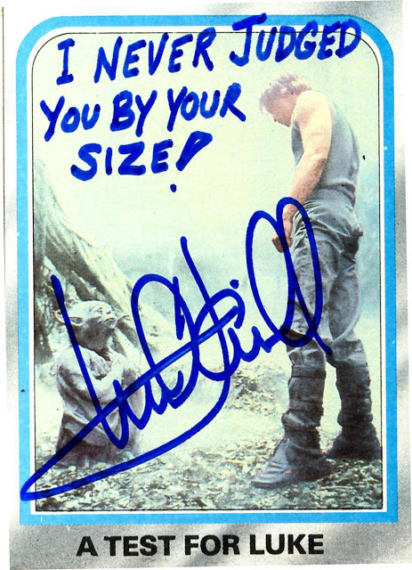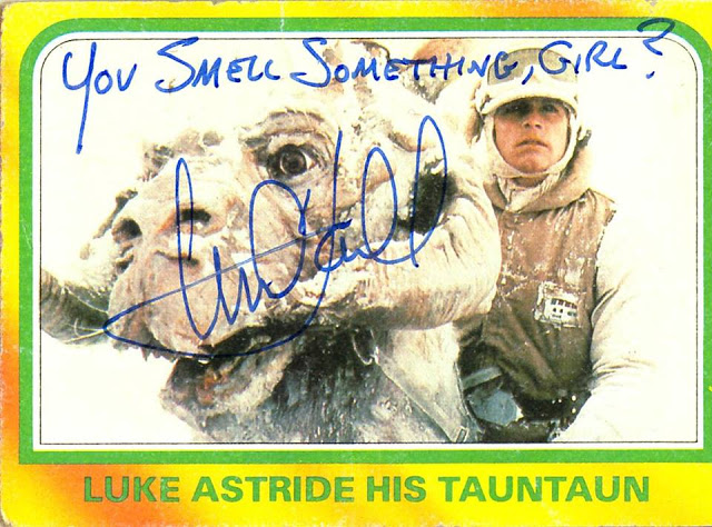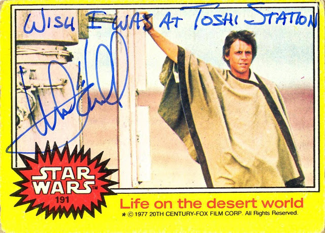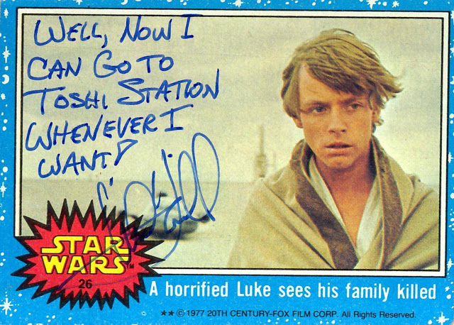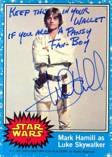 A collection of Star Wars trading cards with autographs and personal notes from Mark Hamill were posted by autograph expert Steve Grad to his Facebook page. Hamill has been signing Star Wars junk for well over 35 years, so it’s no surprise that Luke Skywalker himself has to get a little creative with his autographs.