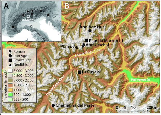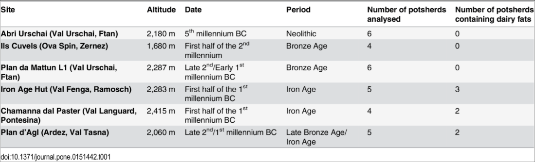 Based mainly on isotopic criteria, dairy lipids could only be identified on ceramics from the stone structures, which date to the Iron Age (ca. 3,000–2,500 BP), providing the earliest evidence of this practice in the high Alps. Dairy production in such a marginal environment implies a high degree of risk even by today’s standards. We postulate that this practice was driven by population increase and climate deterioration that put pressure on lowland agropastoral systems and the establishment of more extensive trade networks, leading to greater demand for highly nutritious and transportable dairy products.