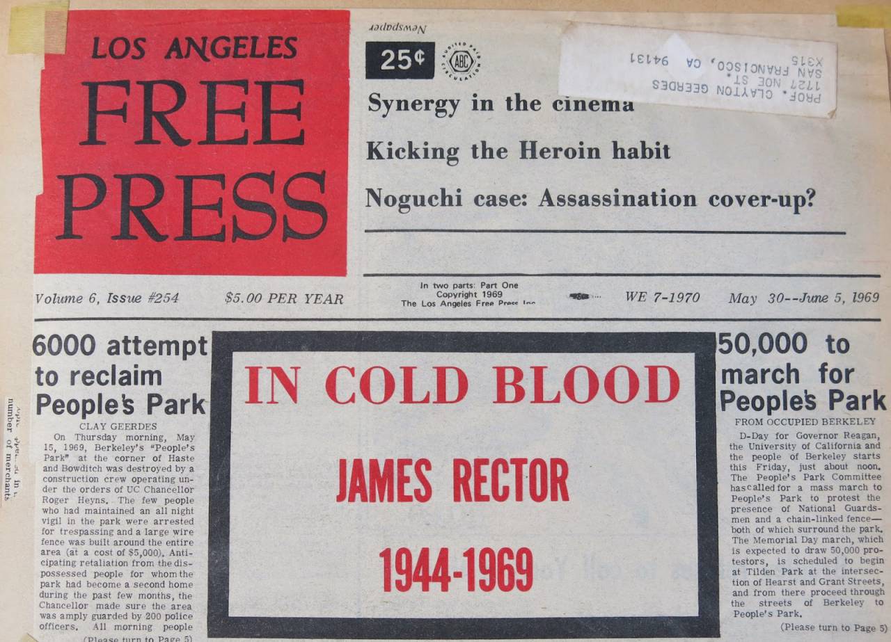 “Well, it was short-lived, because you can’t fight fire with gasoline. Sheriff Frank Madigan armed his cops with shotguns and they started shooting people. Over a hundred people were treated at Highland and other local hospitals for shotgun pellet wounds and one student, James Rector, was killed when he was shot by a passing deputy. It was the Vietnam War come home. Governor Ronald Reagan was willing to destroy Berkeley in order to save it. He had a couple of divisions of paratroopers on standby down at Fort Ord, and he declared a state of emergency in Berkeley, sending in the National Guard. The army drove up and down Durant and Dana and Haste and Bowditch and other Berkeley streets, spraying pepper fog at us.”