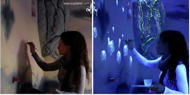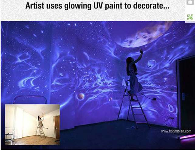 Viennese artist Bogi Fabian has developed techniques for using luminescent and fluorescent paint in interior design that brings an interstellar or extragalactic feel to a room.
