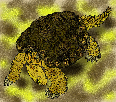 Then, wait. If you’re lucky, you might see a small, hand-sized creature poking its head out of the mud. It looks like a fat lizard, with bulging flanks and stocky legs. But if you managed to grab it and flip it over, you’d find that its flanks are bulging because its ribs are exceptionally wide, broad, and flat, reinforcing its undersides. It’s almost like the little creature has half a shell.