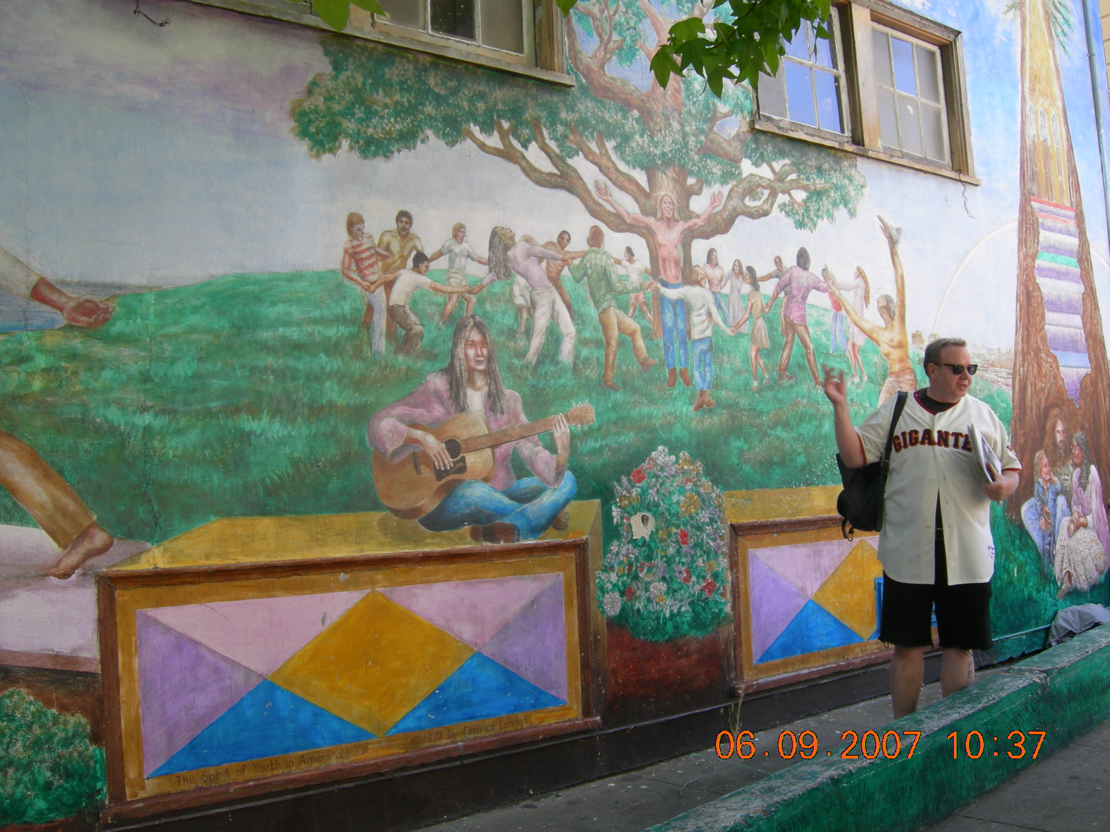 His spiel is lively and full of well-rehearsed, waspish asides. He points to hippie-themed murals, drawn in 1977, on Belvedere Street.