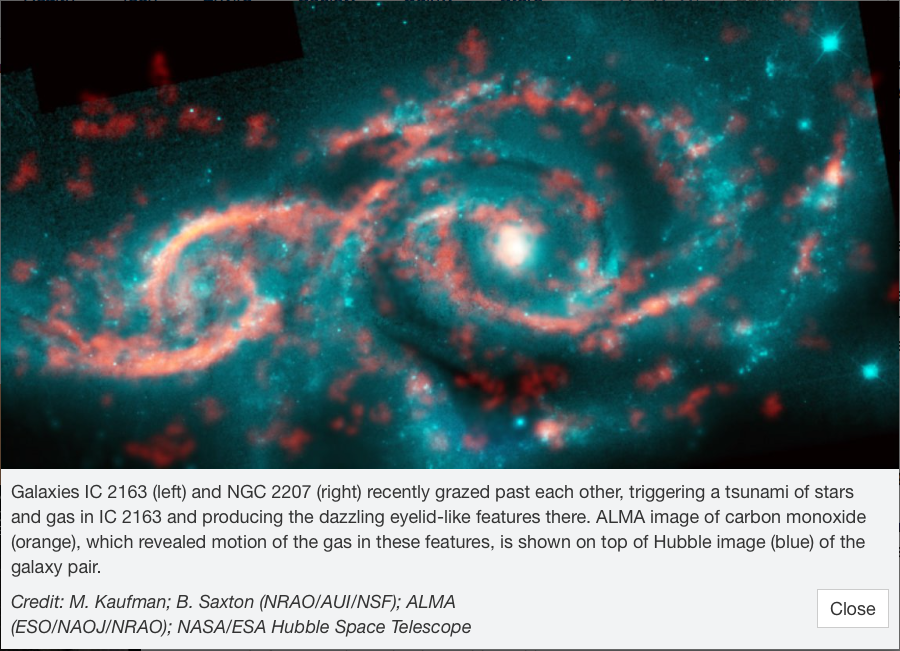 The interacting pair of galaxies resides approximately 114 million light-years from Earth in the direction of the constellation Canis Major. These galaxies brushed past each other — scraping the edges of their outer spiral arms — in what is likely the first encounter of an eventual merger.